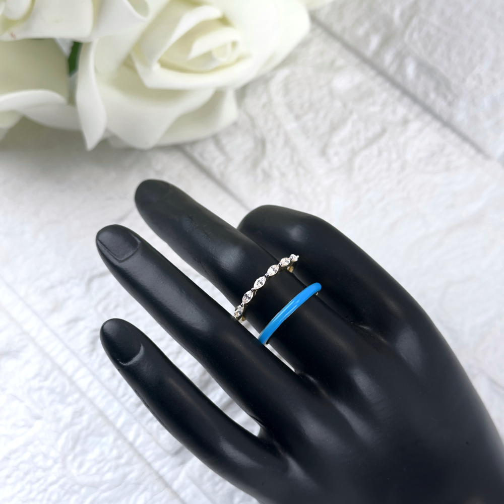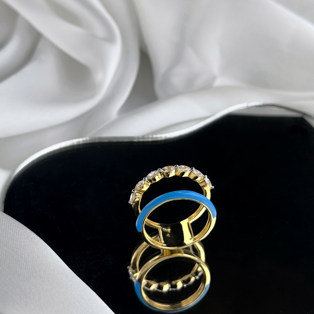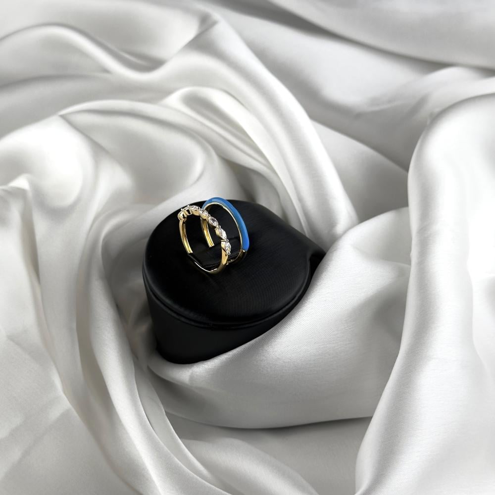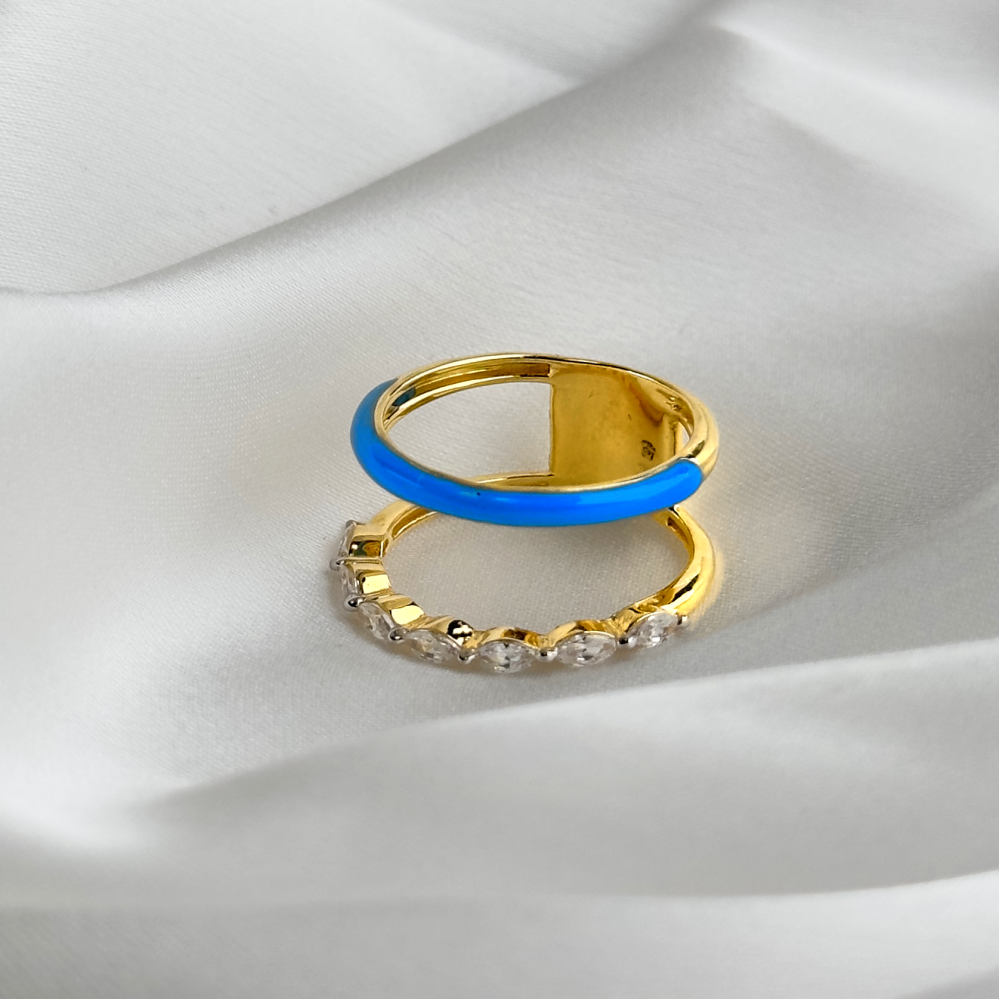 أضيفي لمسة من الأناقة الخالدة إلى إطلالتك مع هذا الخاتم الفاخر، الذي يتميز بلون المينا الأزرق العميق وحجر الزركون الأبيض اللامع. تصميمه الدائري المبتكر يبرز جمال التفاصيل ويجعل كل لحظة تتألق بروعة وجاذبية
